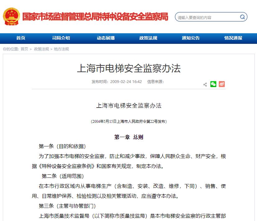 上海市質(zhì)量技術(shù)監(jiān)督局(以下簡稱市質(zhì)量技監(jiān)局)是本市電梯安全監(jiān)察的行政主管部門。區(qū)(縣)質(zhì)量技術(shù)監(jiān)督局(以下簡稱區(qū)(縣)質(zhì)量技監(jiān)局)負(fù)責(zé)本行政區(qū)域內(nèi)電梯的安全監(jiān)察工作。