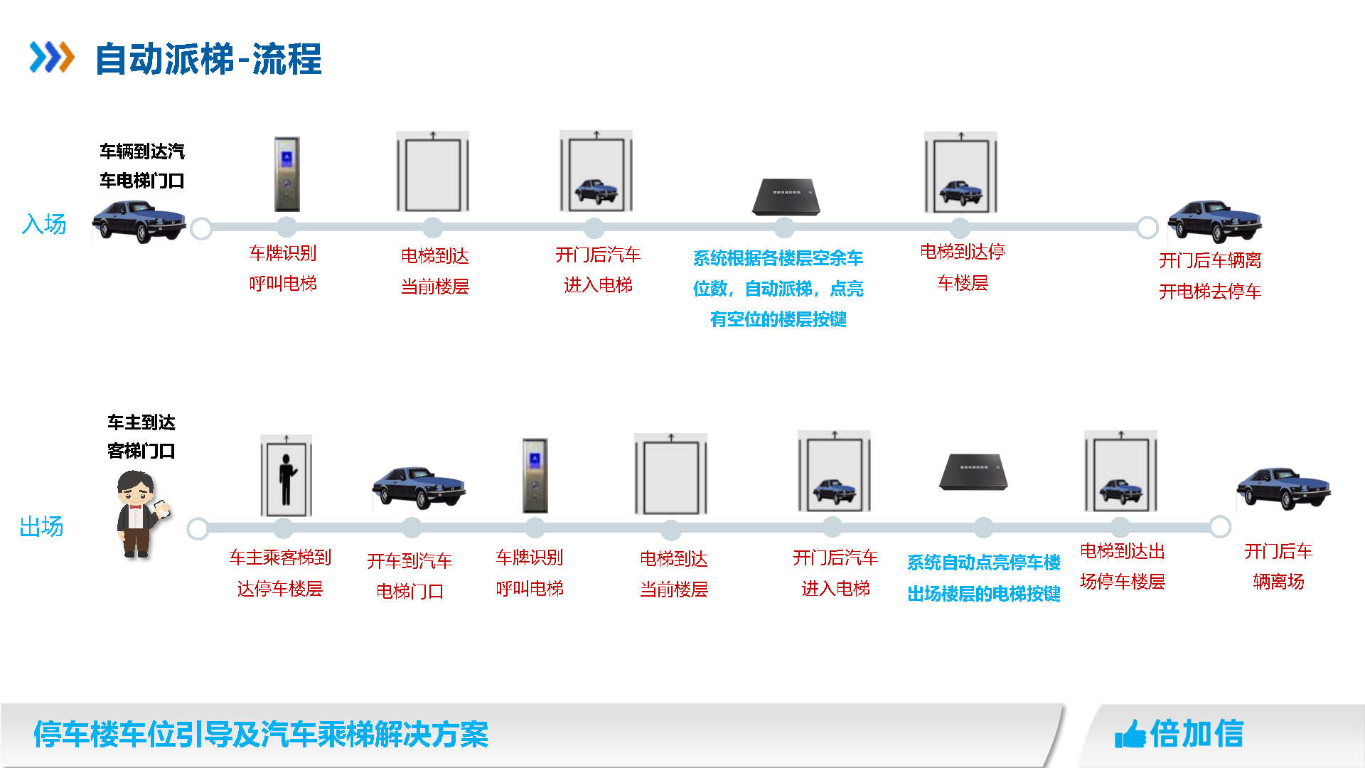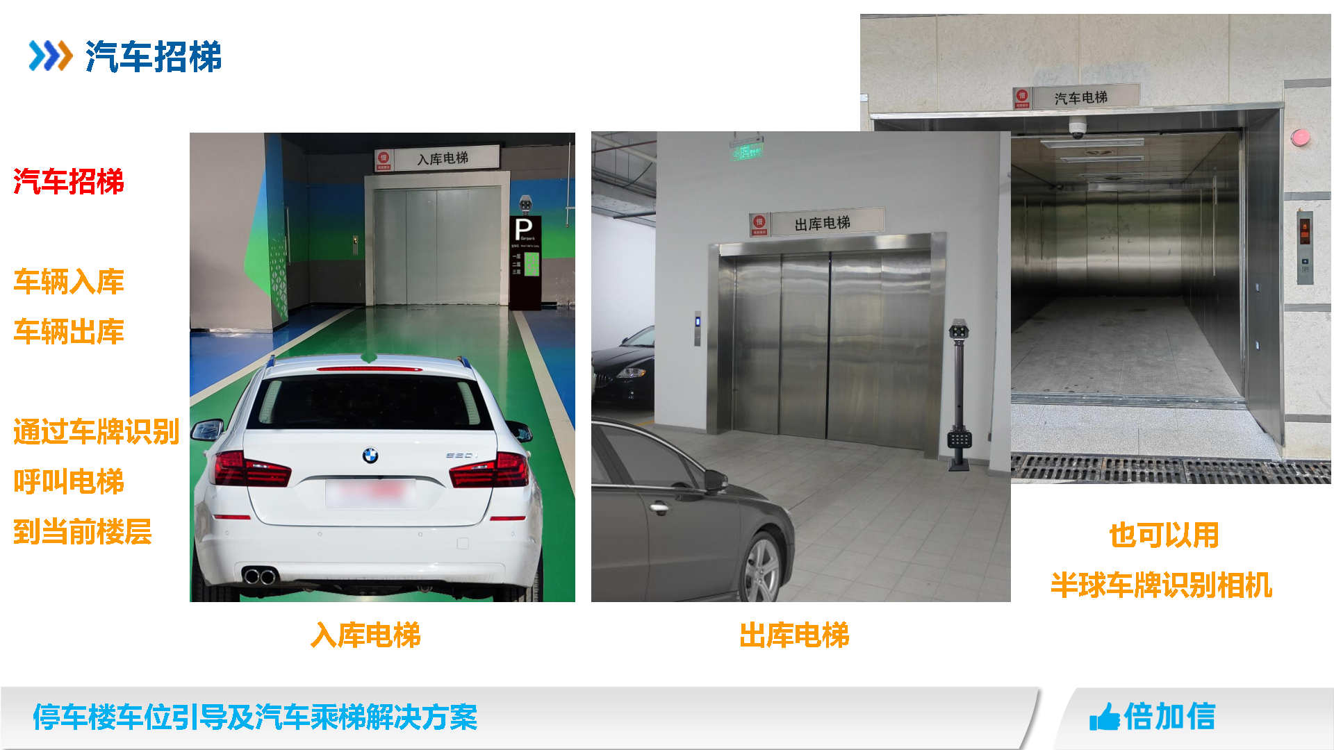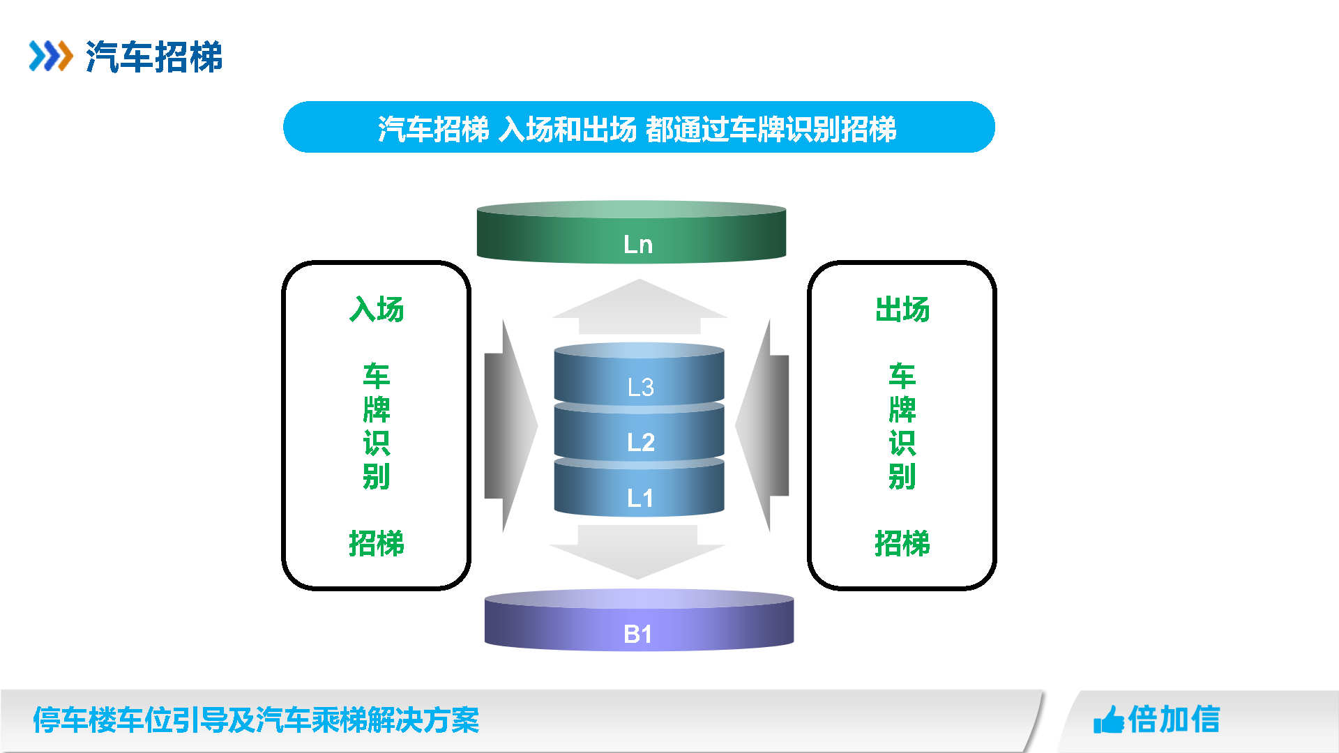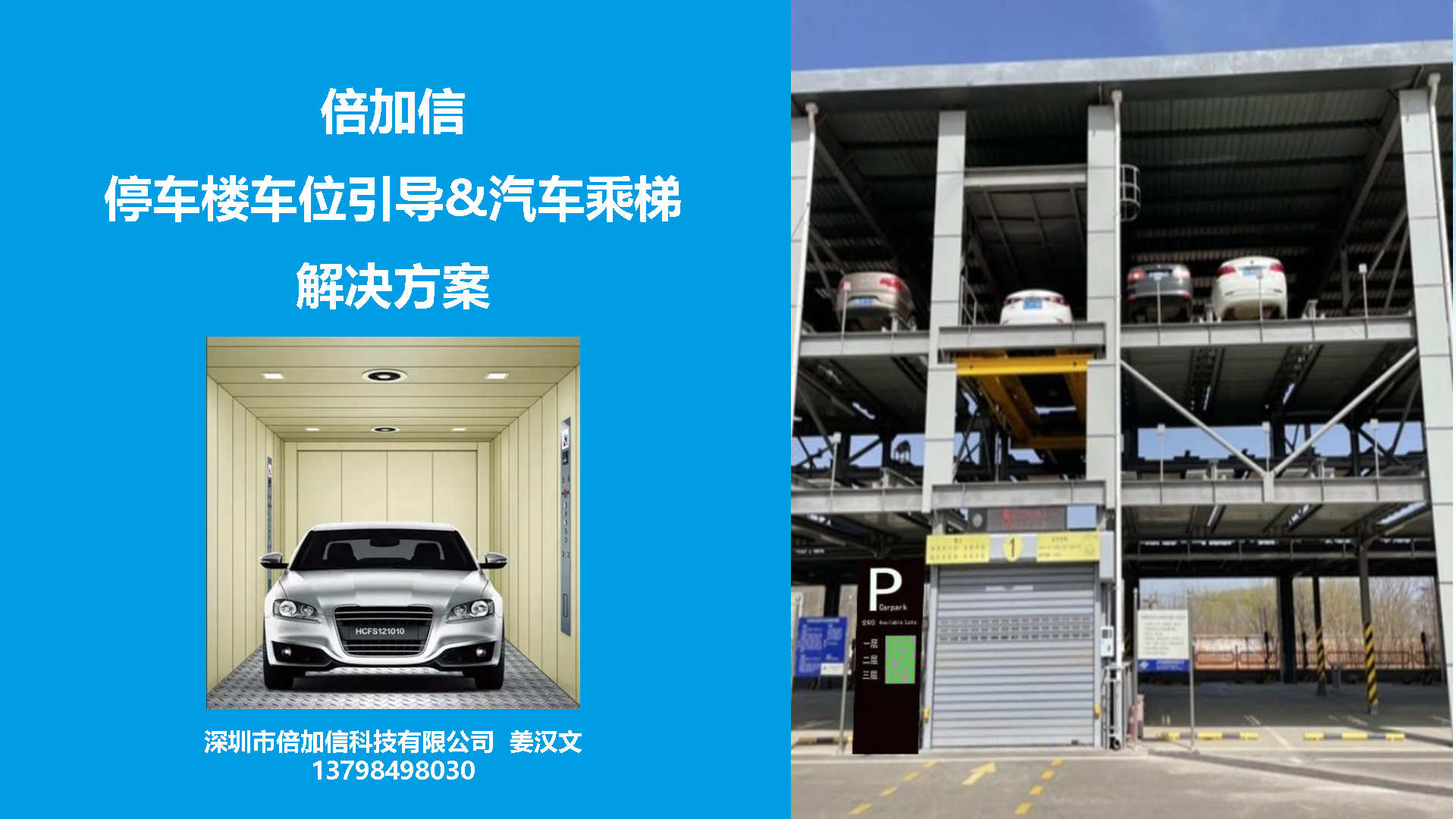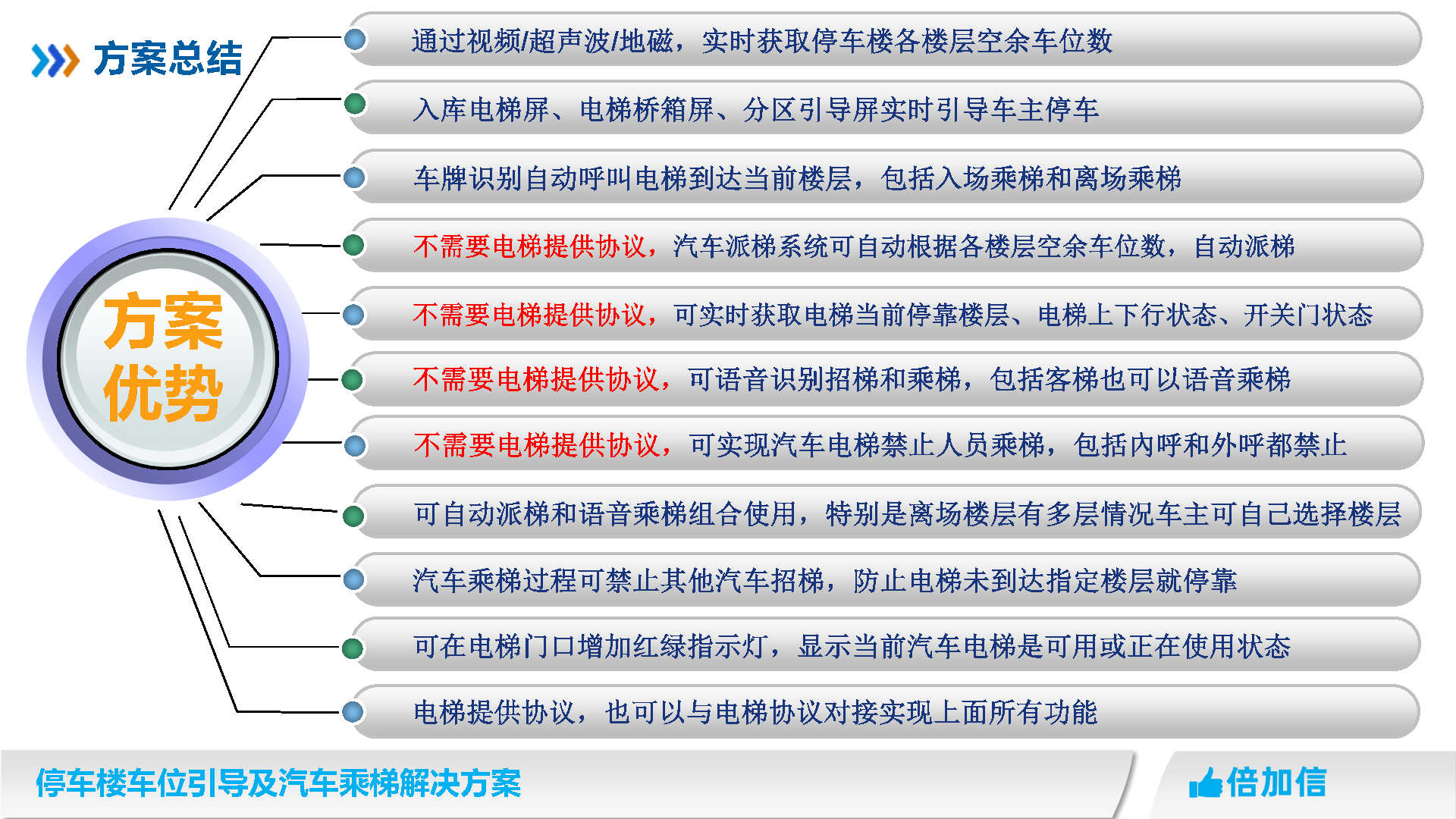 倍加信汽車乘梯系統(tǒng)方案優(yōu)勢 1、通過視頻/超聲波/地磁,實時獲取停車樓各樓層空余車位數(shù)/ 2、入庫電梯屏、電梯橋箱屏、分區(qū)引導(dǎo)屏實時引導(dǎo)車主停車 3、車牌識別自動呼叫電梯到達(dá)當(dāng)前樓層,包括入場乘梯和離場乘梯 4、不需要電梯提供協(xié)議,汽車派梯系統(tǒng)可自動根據(jù)各樓層空余車位數(shù),自動派梯 5、不需要電梯提供協(xié)議,可實時獲取電梯當(dāng)前?繕菍、電梯上下行狀態(tài)、開關(guān)門狀態(tài) 6、不需要電梯提供協(xié)議,可語音識別招梯和乘梯,包括客梯也可以語音乘梯 7、不需要電梯提供協(xié)議,可實現(xiàn)汽車電梯禁止人員乘梯,包括內(nèi)呼和外呼都禁止 8、可自動派梯和語音乘梯組合使用,特別是離場樓層有多層情況車主可自己選擇樓層 9、汽車乘梯過程可禁止其他汽車招梯,防止電梯未到達(dá)指定樓層就? 10、可在電梯門口增加紅綠指示燈,顯示當(dāng)前汽車電梯是可用或正在使用狀態(tài) 11、電梯提供協(xié)議,也可以與電梯協(xié)議對接實現(xiàn)上面所有功能