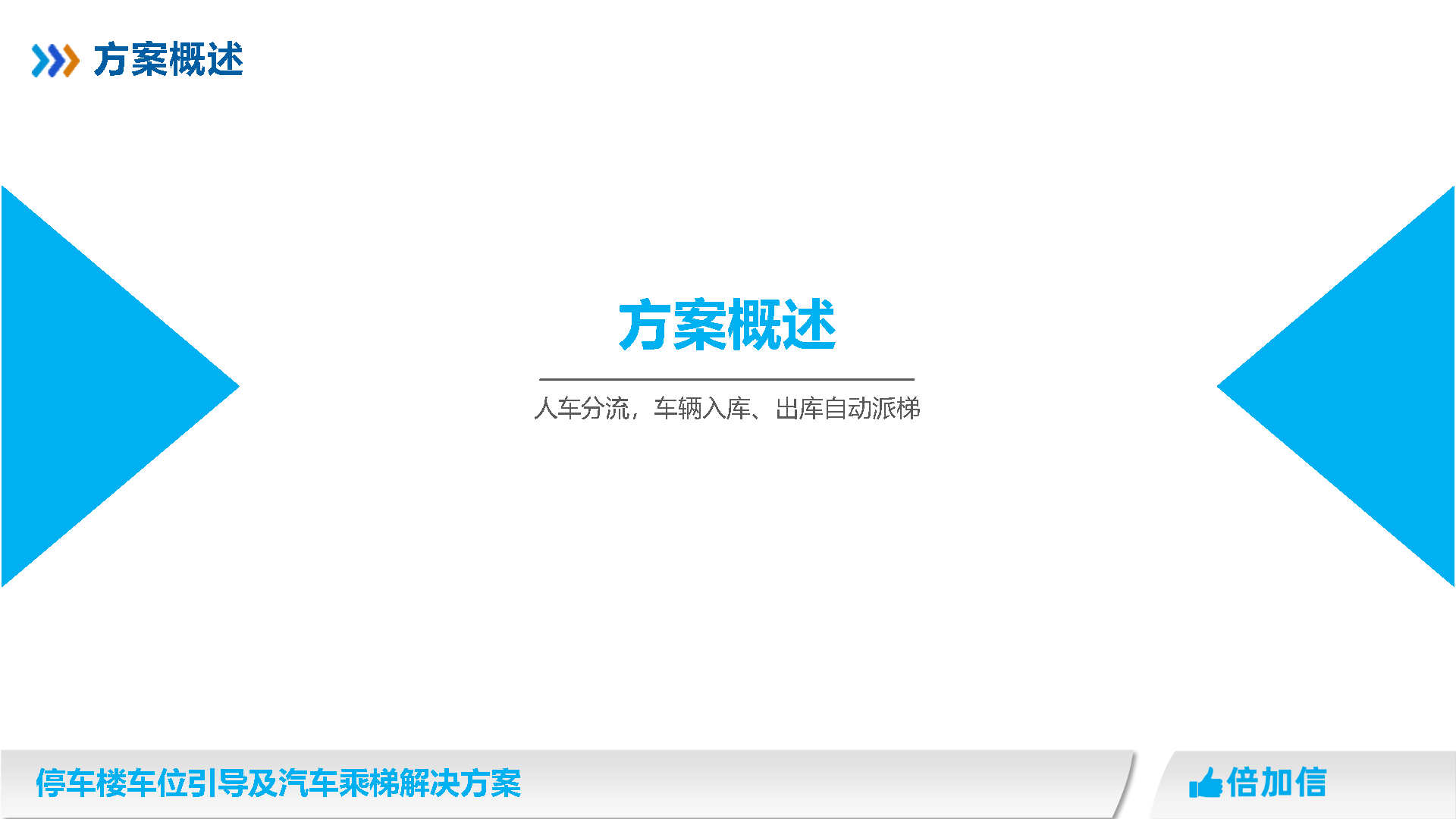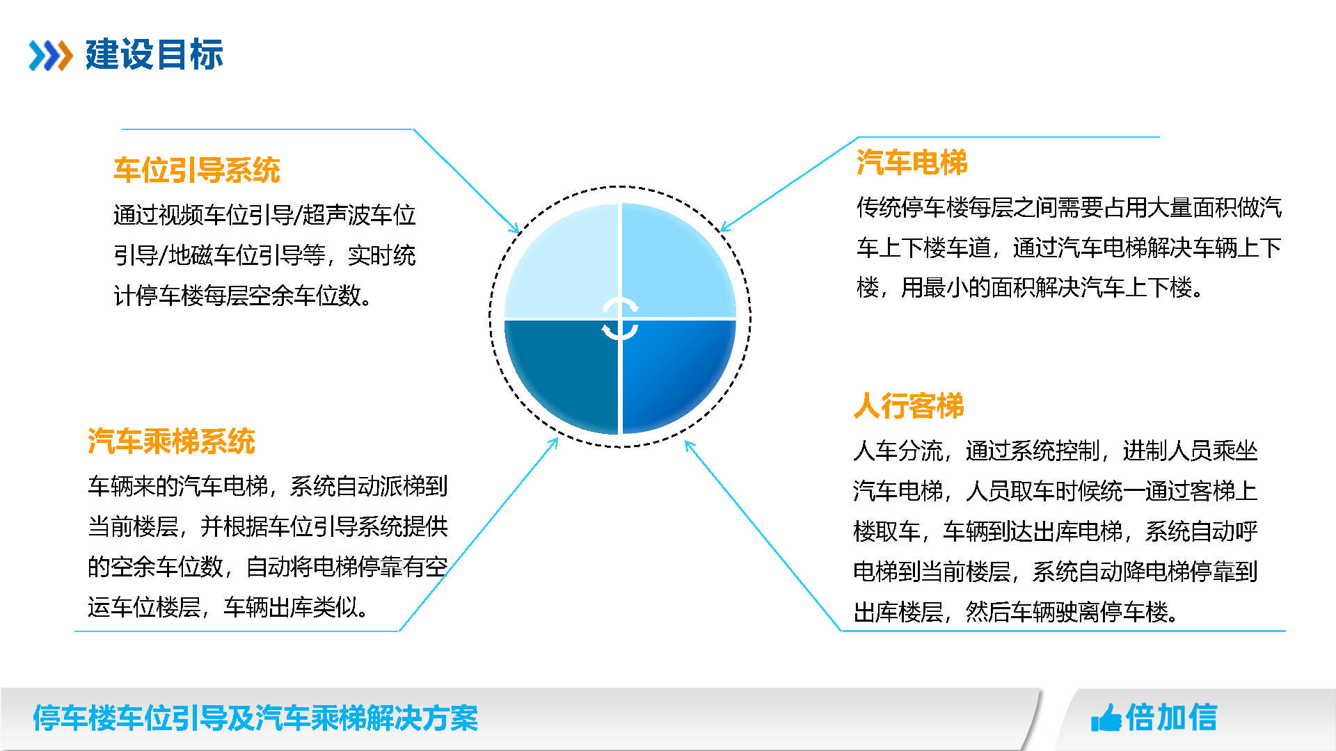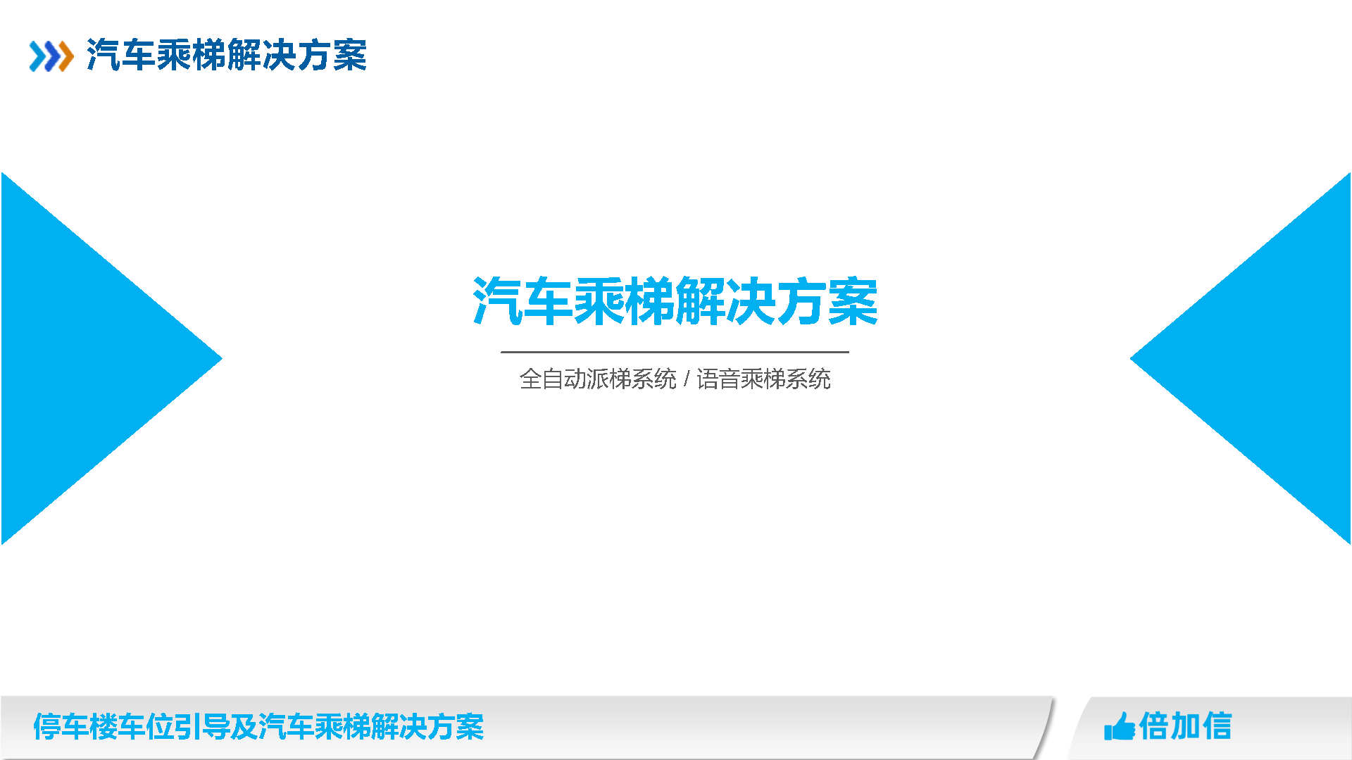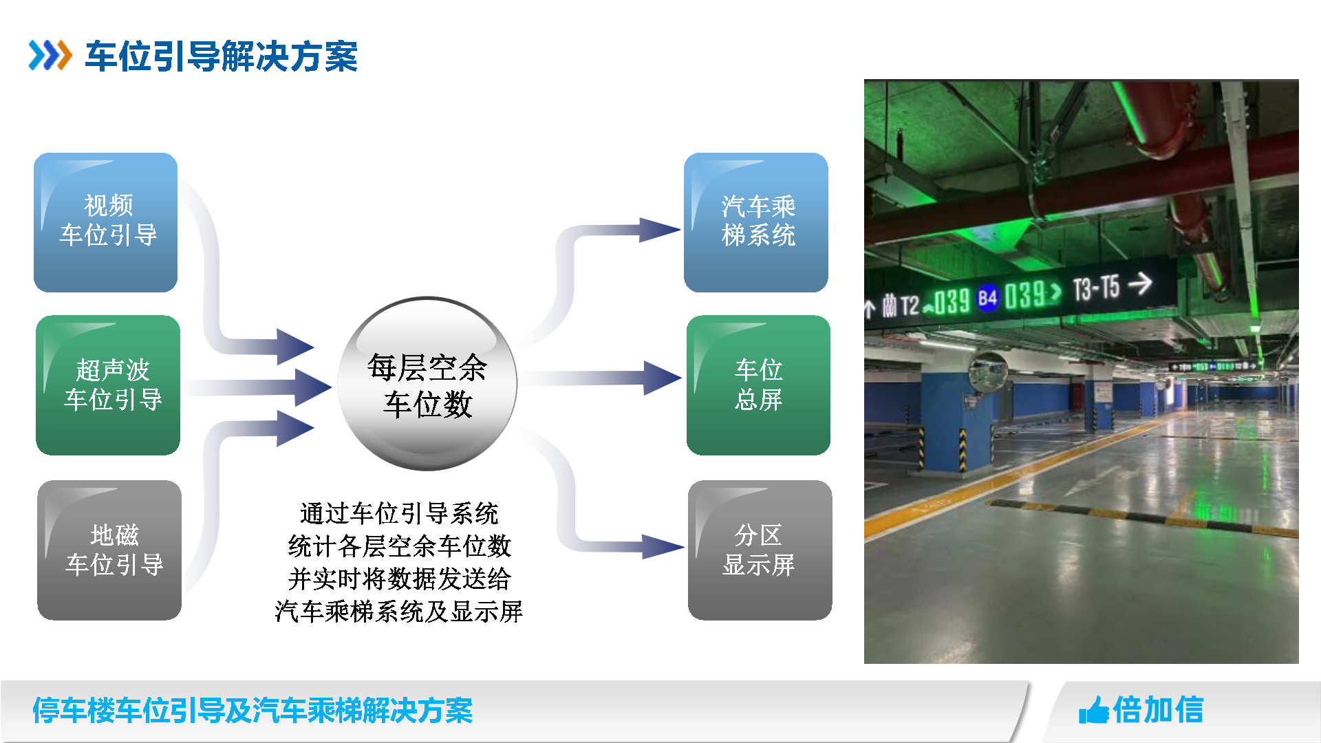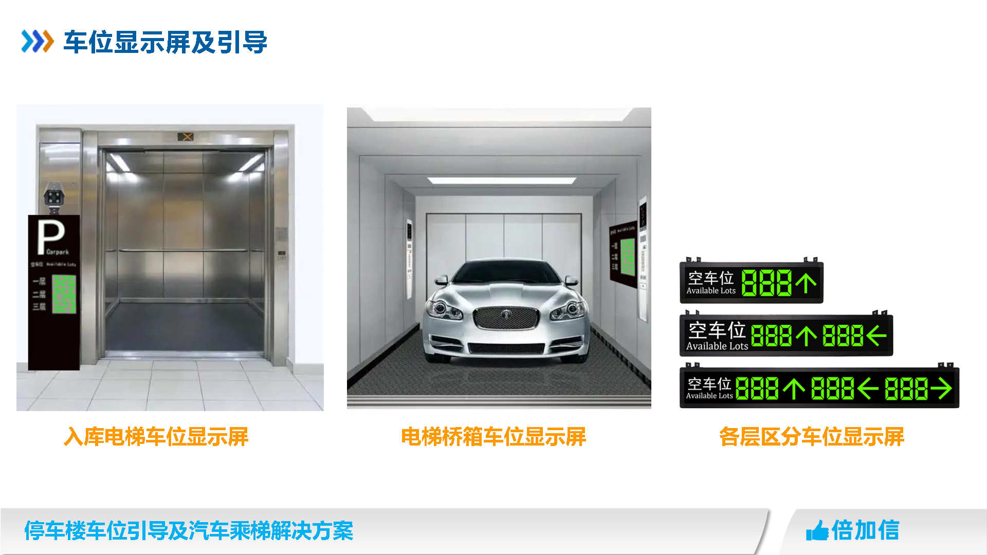 倍加信汽車乘梯系統(tǒng)方案優(yōu)勢 1、通過視頻/超聲波/地磁,實時獲取停車樓各樓層空余車位數(shù)/ 2、入庫電梯屏、電梯橋箱屏、分區(qū)引導(dǎo)屏實時引導(dǎo)車主停車 3、車牌識別自動呼叫電梯到達(dá)當(dāng)前樓層,包括入場乘梯和離場乘梯 4、不需要電梯提供協(xié)議,汽車派梯系統(tǒng)可自動根據(jù)各樓層空余車位數(shù),自動派梯 5、不需要電梯提供協(xié)議,可實時獲取電梯當(dāng)前?繕菍、電梯上下行狀態(tài)、開關(guān)門狀態(tài) 6、不需要電梯提供協(xié)議,可語音識別招梯和乘梯,包括客梯也可以語音乘梯 7、不需要電梯提供協(xié)議,可實現(xiàn)汽車電梯禁止人員乘梯,包括內(nèi)呼和外呼都禁止 8、可自動派梯和語音乘梯組合使用,特別是離場樓層有多層情況車主可自己選擇樓層 9、汽車乘梯過程可禁止其他汽車招梯,防止電梯未到達(dá)指定樓層就? 10、可在電梯門口增加紅綠指示燈,顯示當(dāng)前汽車電梯是可用或正在使用狀態(tài) 11、電梯提供協(xié)議,也可以與電梯協(xié)議對接實現(xiàn)上面所有功能