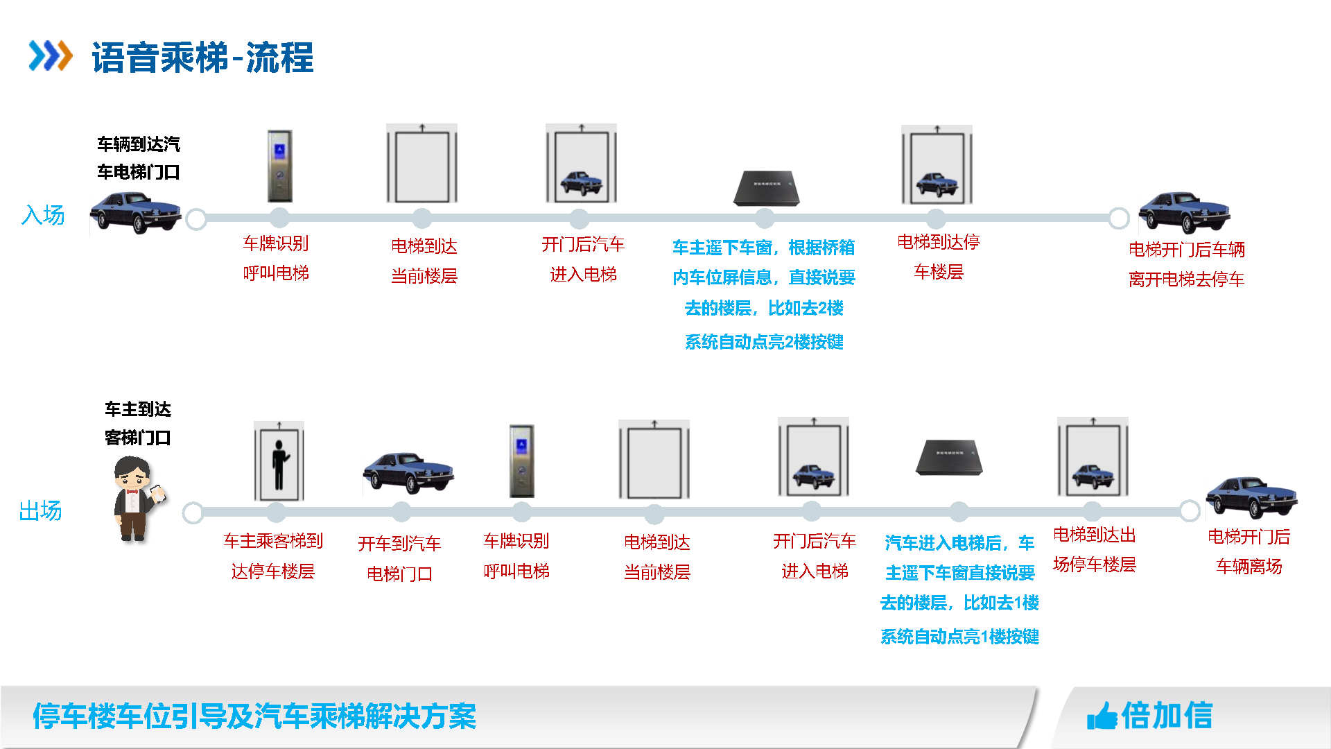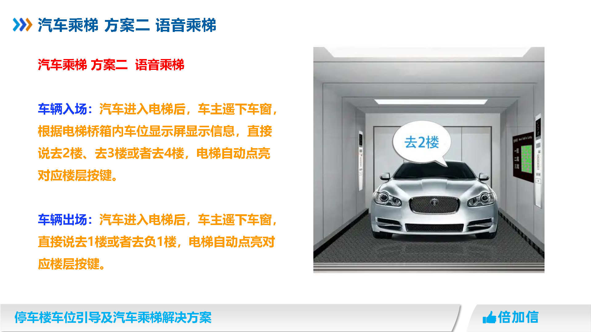 汽車乘梯 方案二 語音乘梯 車輛入場:汽車進(jìn)入電梯后,車主遙下車窗,根據(jù)電梯橋箱內(nèi)車位顯示屏顯示信息,直接說去2樓、去3樓或者去4樓,電梯自動點亮對應(yīng)樓層按鍵。 車輛出場:汽車進(jìn)入電梯后,車主遙下車窗,直接說去1樓或者去負(fù)1樓,電梯自動點亮對應(yīng)樓層按鍵。