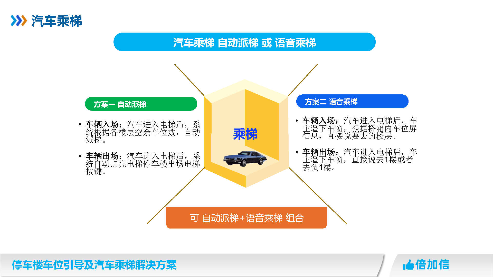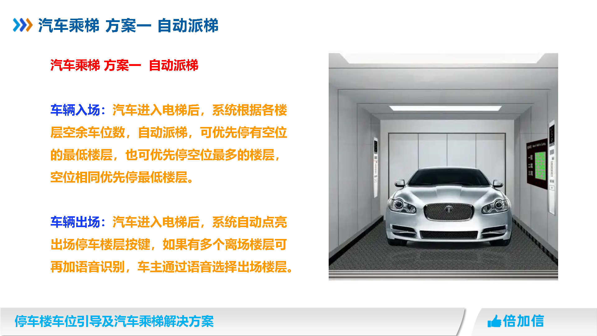 汽車乘梯 方案一 自動派梯 車輛入場:汽車進(jìn)入電梯后,系統(tǒng)根據(jù)各樓層空余車位數(shù),自動派梯,可優(yōu)先停有空位的最低樓層,也可優(yōu)先?瘴蛔疃嗟臉菍樱瘴幌嗤瑑(yōu)先停最低樓層。 車輛出場:汽車進(jìn)入電梯后,系統(tǒng)自動點亮出場停車樓層按鍵,如果有多個離場樓層可再加語音識別,車主通過語音選擇出場樓層