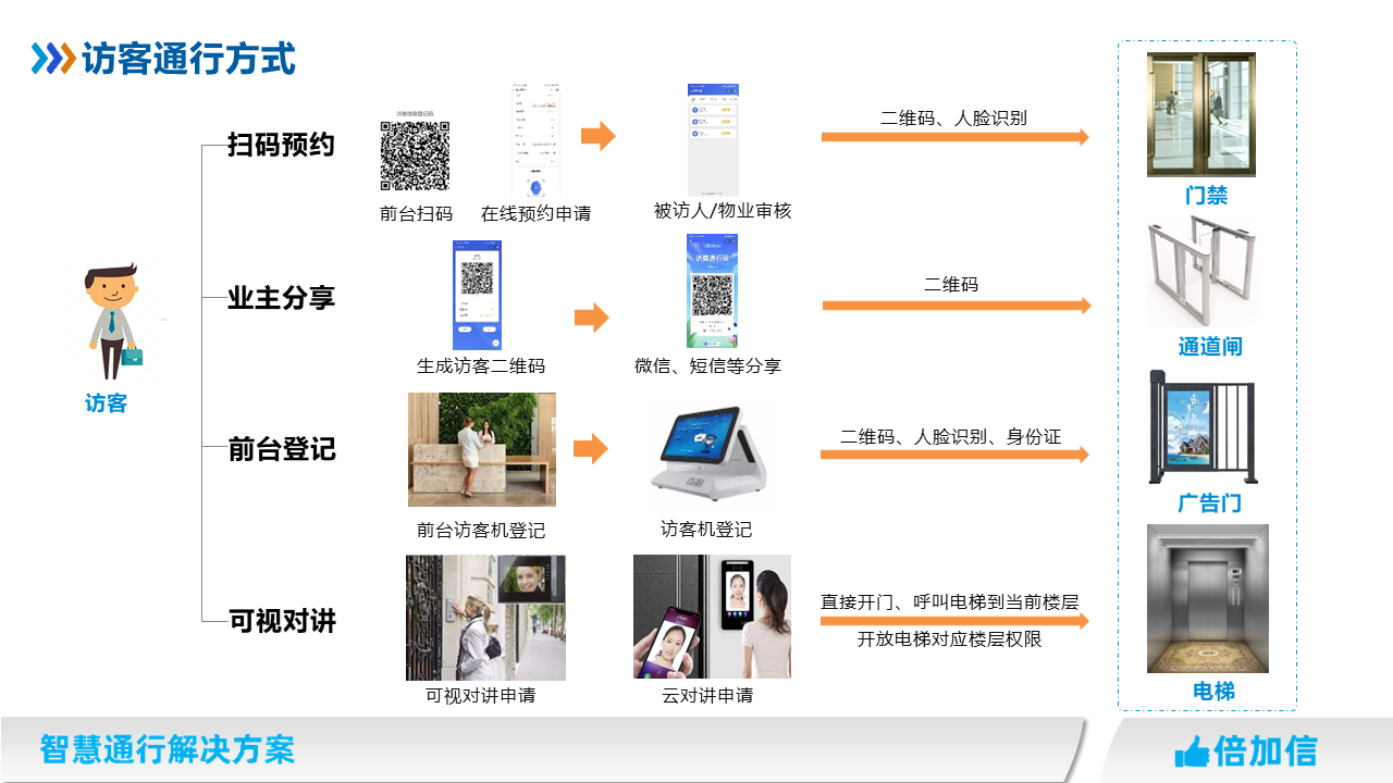 在住宅小區(qū)、寫字樓、園區(qū)、企事業(yè)單位等場所,物業(yè)往往針對外來人員都需要管控,我司提供多種訪客通行解決方案,滿足不同場景訪客進出物業(yè)管理需求。
