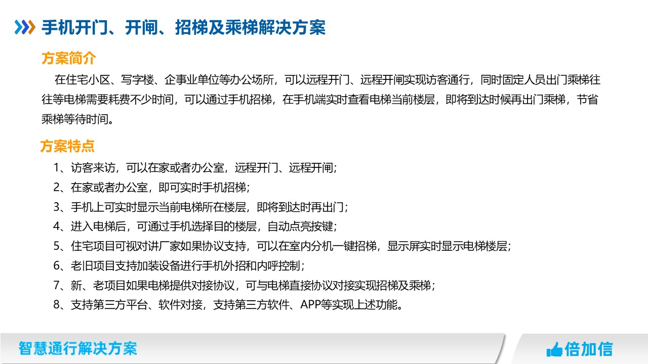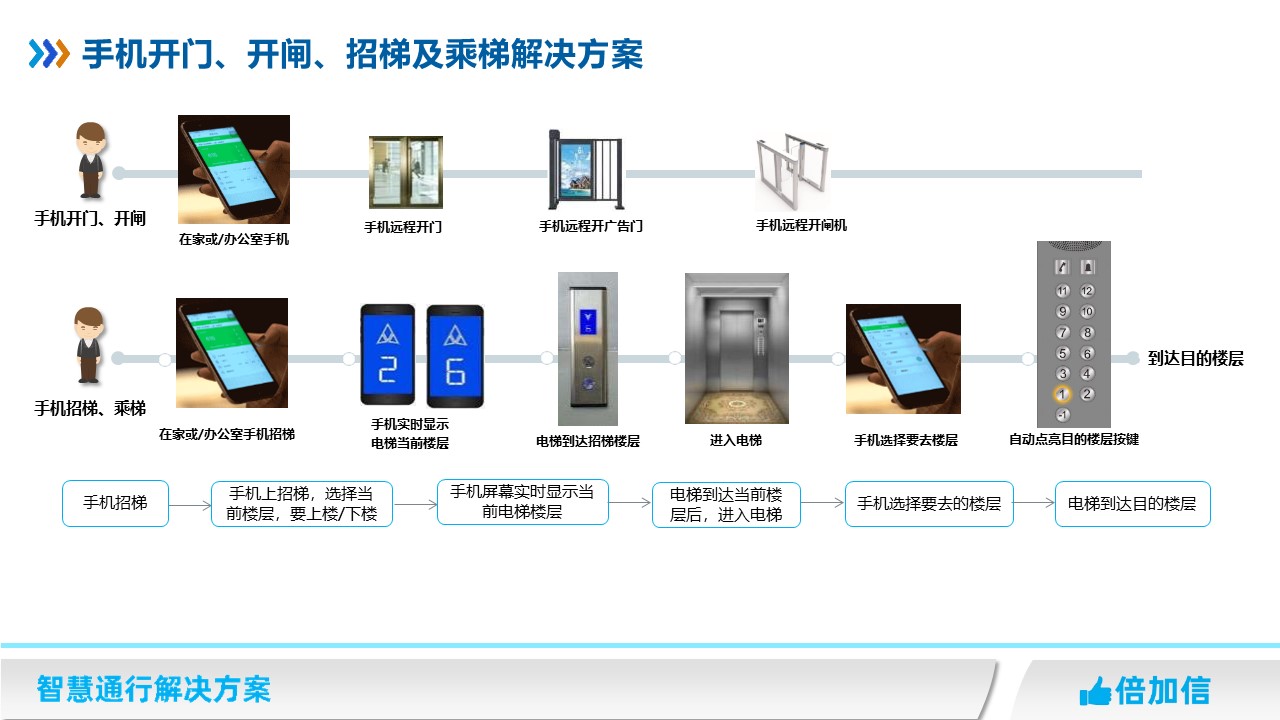在住宅小區(qū)、寫字樓、企事業(yè)單位等辦公場所,可以遠程開門、遠程開閘實現(xiàn)訪客通行,同時固定人員出門乘梯往往等電梯需要耗費不少時間,可以通過手機招梯,在手機端實時查看電梯當前樓層,即將到達時候再出門乘梯,節(jié)省乘梯等待時間。