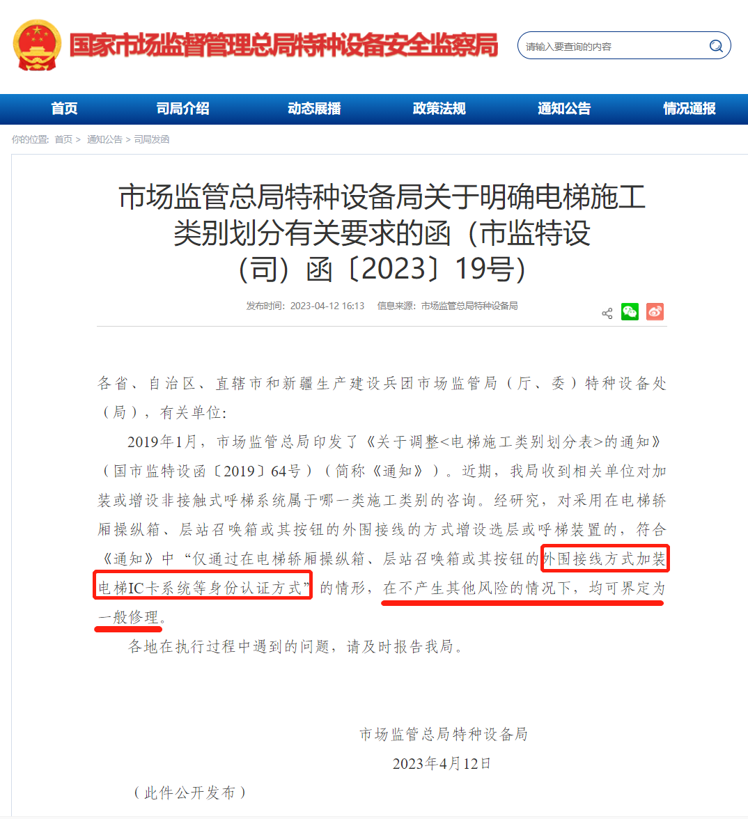 2023年4月12日市場(chǎng)監(jiān)管總局特種設(shè)備局再次發(fā)函,按鍵方式加裝梯控屬于一般修理。