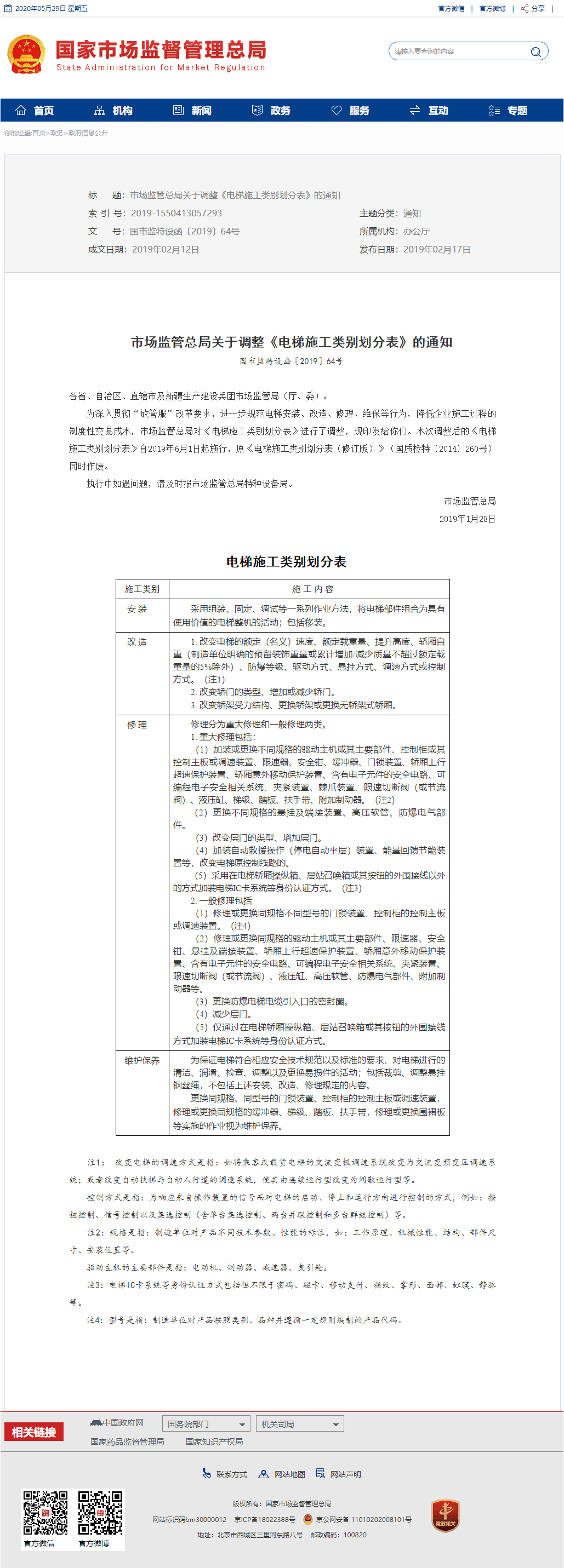 市場(chǎng)監(jiān)管總局關(guān)于調(diào)整《電梯施工類別劃分表》的通知,說(shuō)明了電梯加裝梯控所屬類型,說(shuō)明是容許電梯加裝梯控系統(tǒng)的,電梯加裝梯控是不違法的。